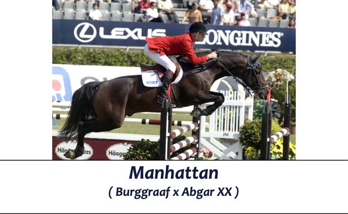 O pai de Manhattan, Burggraaf, é famoso por produzir cavalos de esporte com boa conformação e movimentos. O avô materno de Manhattan é o famoso garanhão puro sangue Abgar XX, um dos mais influentes reprodutores na cria da Holanda. A linha materna de Manhattan é uma das mais famosas da Holanda. Essa linha produziu o talentoso Carrera ( Joost) que ganhou o Grand Prix de Acchen sob a sela de Jean Claude Vangeen-Berghe e Valeur D (Abgar XX) que ganhou duas vezes o Derby de Eindhoven com Wout-Jan van der Schans. Manhattan foi vice campeão em Ermelo na aprovação de garanhões e também nas competições para garanhões em 1999. No ano de 2001 Manhattan obteve boas classificações nas provas de 1,35 mt como um 2º lugar em S’Hertogenbosch e em Denekamp. Ele ganhou o Campeonato de Etten-Leur à 1,40 mt para cavalos de 7 anos e logo começou sua carreira internacional debutando em Leeuwarden com um 2º lugar. Ele obteve também um 2º lugar em Bremen e um 4º e 6º lugares em Barcelona. Em 2002 , Solita, uma filha de Manhattan ganhou o Campeonato Holandes de salto em liberdade e em 2003 ele teve três filhos na aprovação de garanhões do KWPN. Em 2004 seu filho Stetter foi o 4ºcolocado na Mundial de Cavalos Novos 5 anos em Lanaken. Os filhos de Manhattan são muito bonitos, possuem excelente movimentação e grande habilidade para o salto.