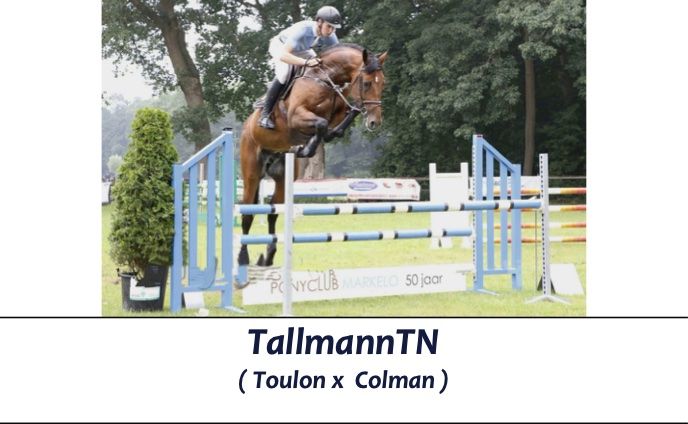 Potência, tamanho e força: são as 3 qualidades que se destacam no garanhão Tallmann TN. Este poderoso garanhão também impressiona pelo seu amplo galope, cuidado e habilidade no salto o que lhe rendeu a aprovação no studbook AES. Com seus primeiros resultados nos concursos, ele segue os passos de sua mãe Hadine van 't Zorgvliet. Montada por Anthony Condon, ela salta os internacionais de 1,45 m e mostra sua habilidade também nas provas de potência . Katalunia – avó de Tallmann- é irmã inteira do saltador de internacionais de 1.50m Konkord (por Corrado I) com Artur Bagdasaryan. Esta linha materna conduz , através do renomado garanhão Joost , a égua Ulzburg. Ela também está na linha materna de Lambrasco (s.Libero H) de Janne-Friederike Meyer vencedor do Grand Prix de Aachen, , bem como de vários outros saltadores de internacional como S.I.E.C. Conceito ( por Concerto II), Cussimo ( por Casall) e Acrobaat Z ( por Athlet). No pedigree de Tallmann TN, esta sólida linha Holsteiner 6372 é unida ao garanhão de Grand Prix Toulon. Este filho de Heartbreaker foi uma celebridade no esporte internacional montado por Hubert Bourdy,. Também na reprodução, ele se destaca com produtos bem sucedidos como Toulago, Dadjak ter Puttenen, Woulon L, AD Living the Dream e Fine Fleur du Marais. Mais genes de alto desempenho são introduzidos ao pedigree de Tallmann através de seu avô materno Colman que produziu entre outros os conhecidos Clouwni ,L B Convall, Con Dios III, Cooper e Catwalk IV.