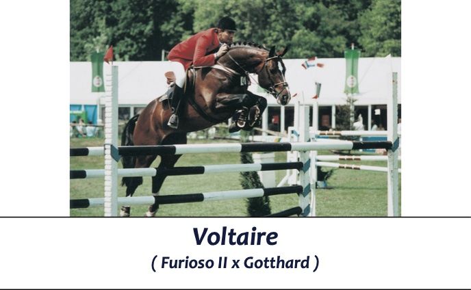 Voltaire é resultado das excelentes linhas de sangue Furioso II e Gothard. Furioso II produziu mais de 200 éguas “ state premium” e ,pelo menos, 70 garanhões aprovados. Gotthard, avô materno de Voltaire, é uma lenda na criação de cavalos de esporte na Alemanha mesmo depois de 15 anos de sua morte. Sua força é transmitida aos seus filhos e netos. É vital, no pedigree de Voltaire, encontrar em sua terceira geração os puro sangues Furioso XX e More Magic XX.